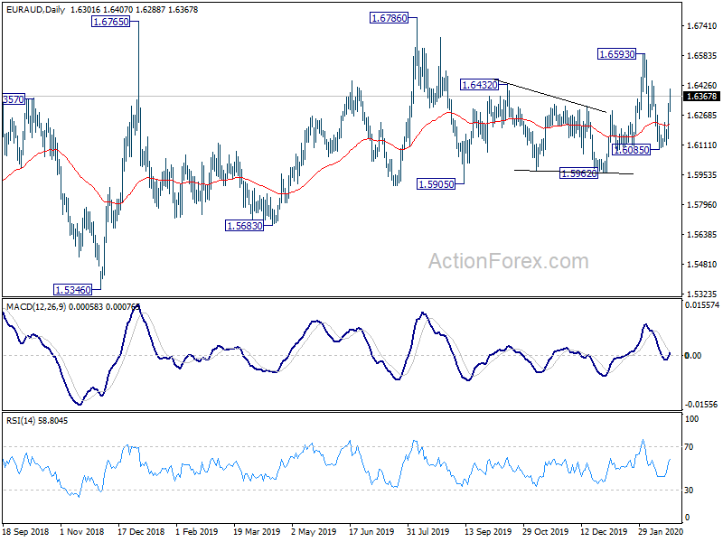 In the bigger picture, EUR/AUD is still struggling in established range of 1.5905/6786. And it’s trying to draw support from 55 week EMA (now at 1.6122) again. For now, larger up trend from 1.1602 (2012 low) is still in favor to continue as long as 1.5962 support holds. Break of 1.6786 will target 61.8% retracement of 2.1127 (2008 high) to 1.1602 at 1.7488.