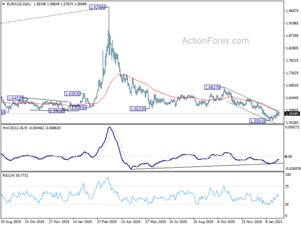 Intraday bias in EUR/AUD stays neutral for the moment. On the upside, sustained break of the channel resistance will argue that fall from 1.6827 has completed at 1.5591. Stronger rise should be seen to 1.6144 support turned resistance. On the downside, break of 1.5760 minor support will retain near term bearishness, and bring retest of 1.5591 low.
