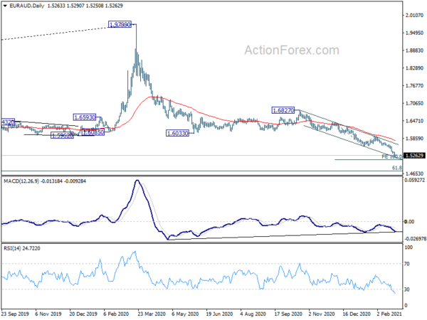 Intraday bias in EUR/AUD remains on the downside at this point. Current down trend from 1.9799 is still in progress for target 100% projection of 1.6409 to 1.5591 from 1.5945 at 1.5127 next. On the upside, above 1.5408 minor resistance will turn bias neutral and bring consolidations first, before staging another fall.