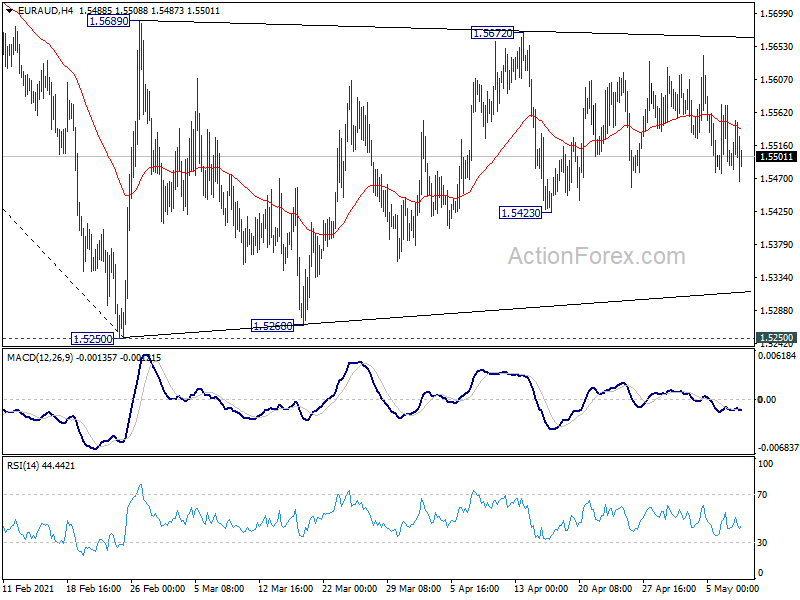 EUR/AUD was still bounded in sideway consolidation form 1.5250 last week. Overall outlook is unchanged and initial bias stays neutral this week first. On the upside, in case of another rise, upside should be limited by 38.2% retracement of 1.6827 to 1.5250 at 1.5852. On the downside, break of 1.5234 will bring retest of 1.5250 low. Overall, down trend from 1.9799 is expected to resume after consolidation from 1.5250 completes.