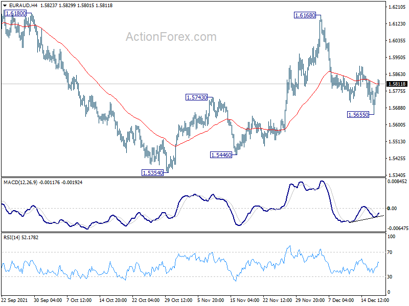 Despite dipping to 1.5655, EUR/AUD quickly recovered. Intraday bias remains neutral first. On the downside, break of 1.5655 will revive the case that rebound from 1.5354 has completed, and bring retest of this support. On the upside, break of 1.6168 will resume the rise from 1.5354 to 1.6434 resistance.