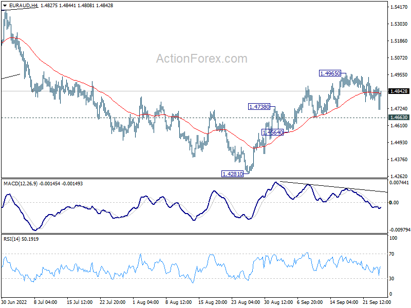 EUR/AUD is staying in consolidation from 1.4965 and intraday bias stays neutral. Further rally is in favor as long as 1.4663 minor support holds. On the upside, break of 1.4965 will resume the rise from 1.4281 towards 1.5396 resistance. On the downside, however, break of 1.4663 minor support will turn bias back to the downside for retesting 1.4281 low.