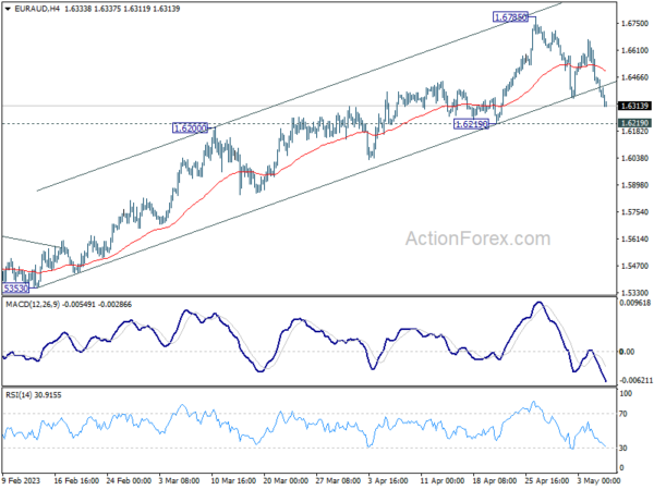 EUR/AUD’s pull back from 1.6785 extended lower last week but stayed above 1.6219 support. Initial bias remains neutral first and further rally is in favor. On the upside, break of 1.6785 will resume larger up trend to 100% projection of 1.4281 to 1.5976 from 1.5254 at 1.6949. However, considering bearish divergence condition in D MACD, decisive break of 1.6219 will argue that it’s already in correction to whole up trend from 1.4281. Deeper decline would then be seen towards 1.5254/5976 support zone instead.