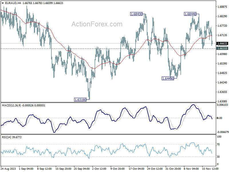 Intraday bias in EUR/AUD remains neutral for the moment, and some more consolidations could be seen. On the upside, sustained break of 1.6843/4 will resume the rebound from 1.6319 for retesting 1.7062 high next. On the downside, however, below 1.6631 minor support will turn bias back to the downside for 1.6449 support instead.