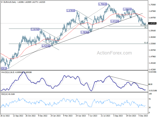In the bigger picture, fall from 1.7062 medium term top is seen as correcting the whole up trend from 1.4281 (2022 low). Deeper decline would be seen to 38.2% retracement of 1.4281 to 1.7062 at 1.6000. Strong support could be seen there to bring rebound on first attempt. But risk will stay on the downside as long as 1.6844 resistance holds. Sustained break of 1.6000 would bring further fall to 61.8% retracement at 1.5343.