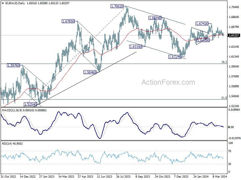 Intraday bias in EUR/AUD remains neutral for the moment. Near term outlook will stay cautiously bullish as long as 1.6439 support holds. On the upside, above 1.6677 will target 1.6742 first. Decisive break there will resume whole rise from 1.6127 and target 1.6844 resistance next.