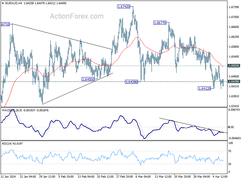 Intraday bias in EUR/AUD remains neutral first. On the downside, break of 1.6412 and sustained trading below 1.6439 support will argue that whole rebound from 1.6127 has completed, and turn near term outlook bearish for this support again. Nevertheless, strong rebound from current level, followed by break of 1.6503 minor resistance, will turn bias back to the upside for retesting 1.6742.