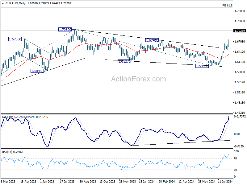 EUR/AUD surges to as high as 1.7189 so far today, and the breach of 1.7062 resistance suggests larger rally resumption. Intraday bias remains on the upside for 1.7715 fibonacci projection level next. On the downside, below 1.6770 minor support will turn intraday bias neutral and bring consolidations first, before staging another rally.