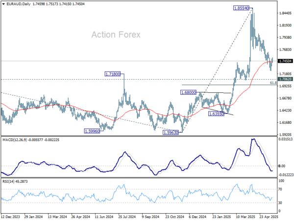 In the bigger picture, as long as 1.7062 resistance turned support (2023 high) holds, up trend from up trend from 1.4281 (2022 low) should still be in progress. However, sustained break of 1.7062 will confirm medium term topping and bring deeper fall back to 1.5963 support.