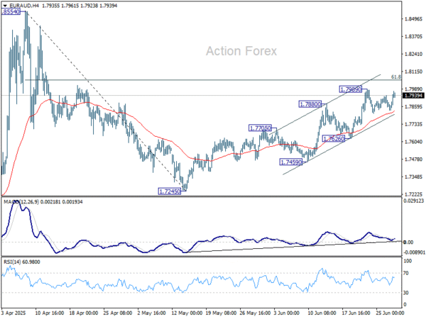 EUR/AUD edged higher to 1.7989 last week but turned sideway since then. Initial bias stays neutral this week first, and further rally is expected as long as 1.7626 support holds. Above 1.7989 will target 61.8% retracement of 1.8554 to 1.7245 at 1.8054. Sustained break there will pave the way to 1.8554.