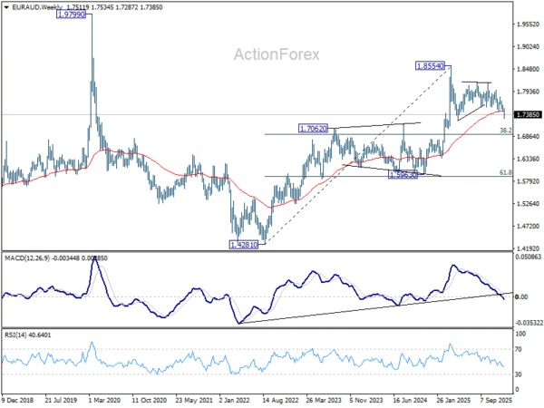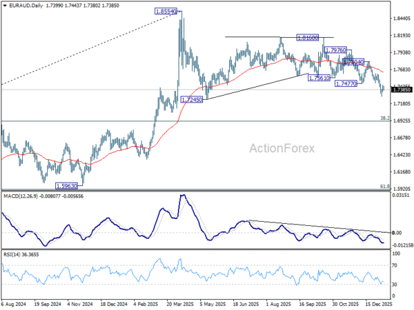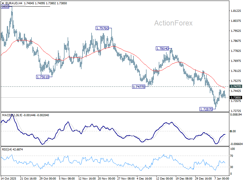 EUR/AUD’s fall from 1.8160 accelerated to 1.7287 last week but recovered since then. Initial bias remains neutral this week first. Risk will stay on the downside as long as 1.7477 support turned resistance holds. Current decline is seen as the third leg of the corrective pattern from 1.8554. Below 1.7287 will target 1.7245 support, and then 1.6922 fibonacci level. Nevertheless, firm break of 1.7477 will indicate short term bottoming, and bring stronger rebound back to 55 D EMA (now at 1.7645).