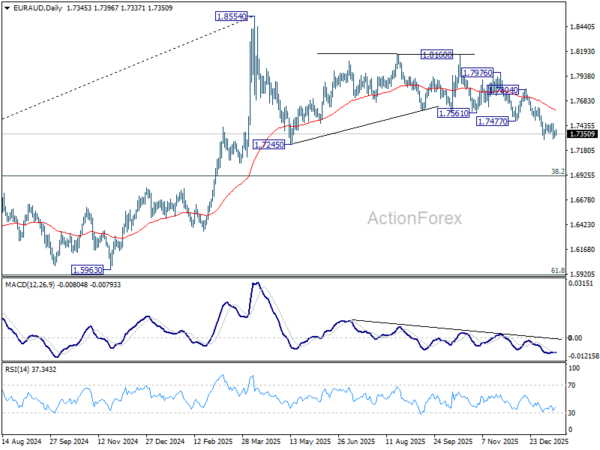 Range trading continues in EUR/AUD and intraday bias stays neutral at this point. Further decline is in favor with 1.7477 support turned resistance intact. On the downside, break of 1.7287 will resume the fall from 1.8160. As this is seen as the third leg of the corrective pattern from 1.8554, deeper fall should be seen to 1.7245 support and below. Nevertheless, firm break of 1.7477 will indicate short term bottoming, and bring stronger rebound back to 55 D EMA (now at 1.7593).
