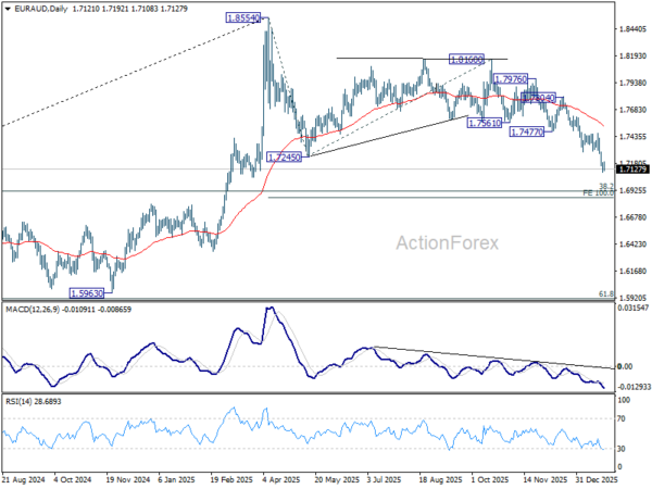 Intraday bias in EUR/AUD remains on the downside for the moment. Current fall is seen as the third leg of the pattern from 1.8554. Deeper decline should continue to 100% projection of 1.8554 to 1.7245 from 1.8160 at 1.6851. On the upside, above 1.7211 support turned resistance will turn intraday bias neutral first, and bring consolidations, before staging another decline.