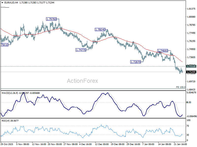 Intraday bias in EUR/AUD remains on the downside for the moment. Current fall is seen as the third leg of the pattern from 1.8554. Deeper decline should continue to 100% projection of 1.8554 to 1.7245 from 1.8160 at 1.6851. On the upside, above 1.7211 support turned resistance will turn intraday bias neutral first, and bring consolidations, before staging another decline.