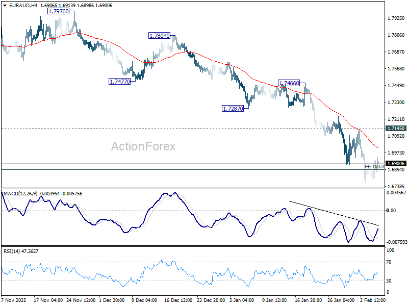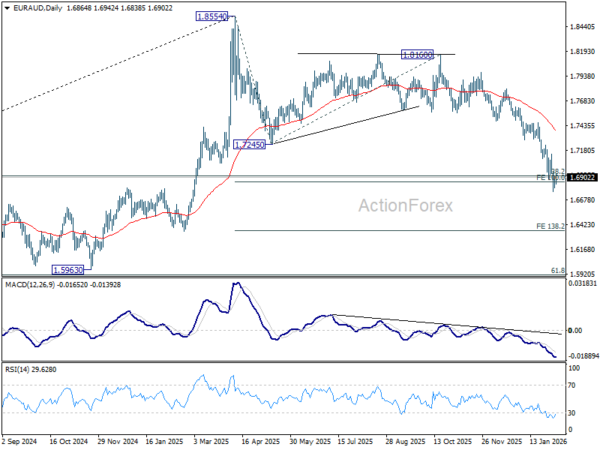 Further decline is expected in EUR/AUD as long as 1.7145 resistance holds. Sustained trading below 100% projection of 1.8554 to 1.7245 from 1.8160 at 1.6851 will pave the way to 138.2% projection at 1.6351 next. However, break of 1.7145 will confirm short term bottoming, and turn bias back to the upside for stronger rebound.