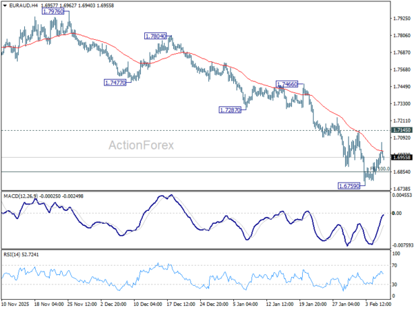 Intraday bias in EUR/AUD is turned neutral first with current recovery. But risk stays on the downside with 1.7145 resistance intact. On the downside, sustained trading below 100% projection of 1.8554 to 1.7245 from 1.8160 at 1.6851 will pave the way to 138.2% projection at 1.6351 next. However, break of 1.7145 will confirm short term bottoming, and turn bias back to the upside for stronger rebound.