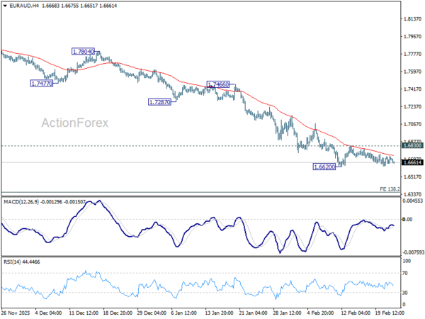 Intraday bias in EUR/AUD remains neutral as consolidations from 1.6620 is still in progress. Further decline is expected with 1.6830 resistance intact. On the downside, decisive break of 1.6620 will resume the larger decline from 1.8554 to 138.2% projection of 1.8554 to 1.7245 from 1.8160 at 1.6351 next. However, firm break of 1.6830 resistance will indicate short term bottoming, and bring stronger rebound.