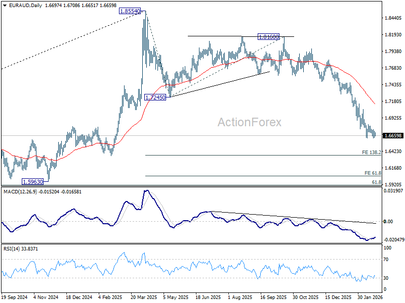 Intraday bias in EUR/AUD remains neutral as consolidations from 1.6620 is still in progress. Further decline is expected with 1.6830 resistance intact. On the downside, decisive break of 1.6620 will resume the larger decline from 1.8554 to 138.2% projection of 1.8554 to 1.7245 from 1.8160 at 1.6351 next. However, firm break of 1.6830 resistance will indicate short term bottoming, and bring stronger rebound.