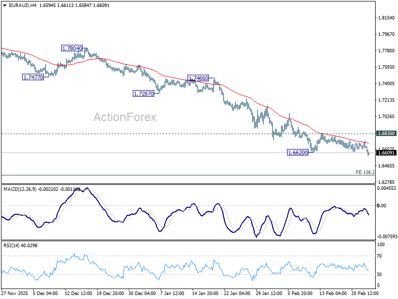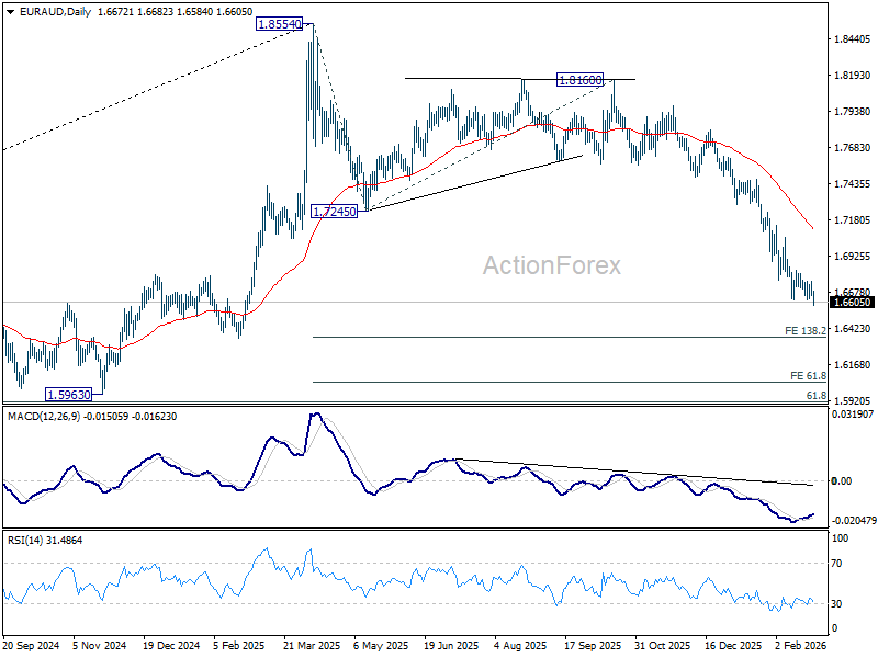 Intraday bias in EUR/AUD is back on the downside with break of 1.6620 support. Fall from 1.8554 is resuming and should target 138.2% projection of 1.8554 to 1.7245 from 1.8160 at 1.6351 next. Near term outlook will remain bearish as long as 1.6830 resistance holds, in case of recovery.