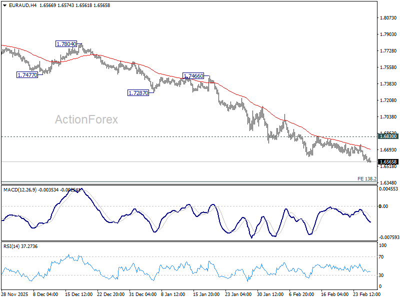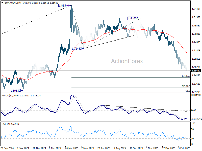 Intraday bias in EUR/AUD remains on the downside for the moment. Fall from 1.8554 is in progress and should target 138.2% projection of 1.8554 to 1.7245 from 1.8160 at 1.6351 next. Near term outlook will remain bearish as long as 1.6830 resistance holds, in case of recovery.