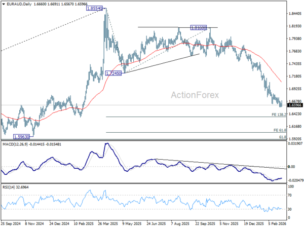 Further decline is expected in EUR/AUD with 1.6830 resistance intact, despite some loss of downside momentum. Current fall should continue to 138.2% projection of 1.8554 to 1.7245 from 1.8160 at 1.6351. However, firm break of 1.6830 resistance will confirm short term bottoming, on bullish convergence condition in 4H MACD, and turn bias back to the upside for stronger rebound.