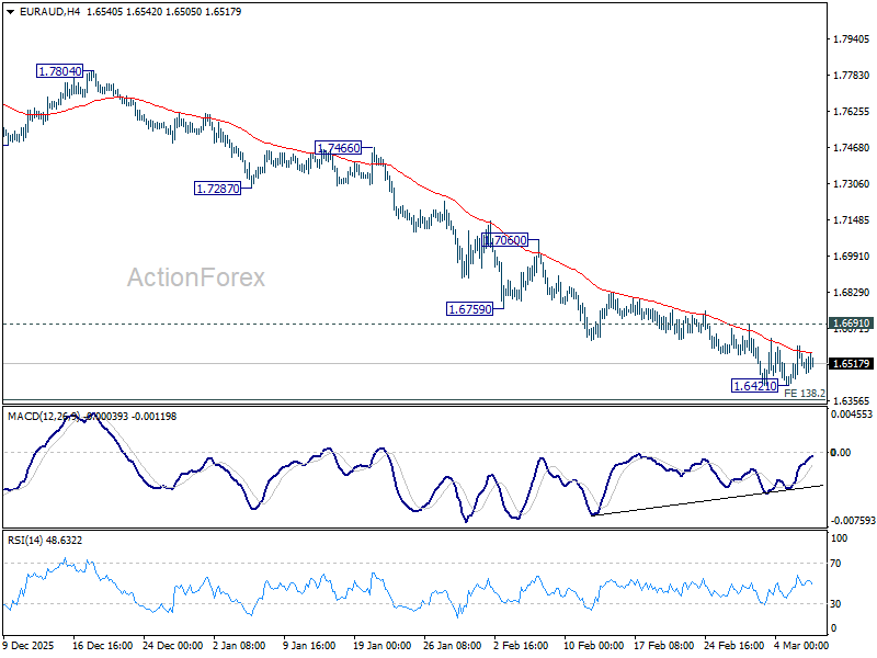 EUR/AUD edged lower to 1.6421 last week but recovered. Initial bias remains neutral this week first. On the downside, sustained break of 138.2% projection of 1.8554 to 1.7245 from 1.8160 at 1.6351 will extend larger down trend to 161.8% projection at 1.6042 next. However, considering bullish convergence condition in 4H MACD, firm break of 1.6691 resistance will indicate short term bottoming. Intraday bias will be back on the upside for stronger rebound towards 55 D EMA (now at 1.6979).