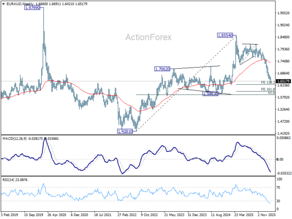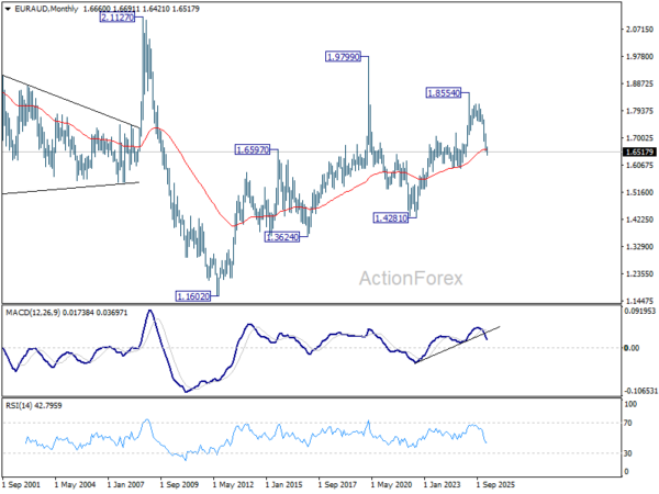 In the bigger picture, fall from 1.8554 medium term top is seen as reversing the whole up trend from 1.4281 (2022 low). Deeper decline should be seen to 61.8% retracement of 1.4281 to 1.8554 at 1.5913, which is slightly below 1.5963 structural support. For now, risk will stay on the downside as long as 1.7245 support turned resistance holds, even in case of strong rebound.