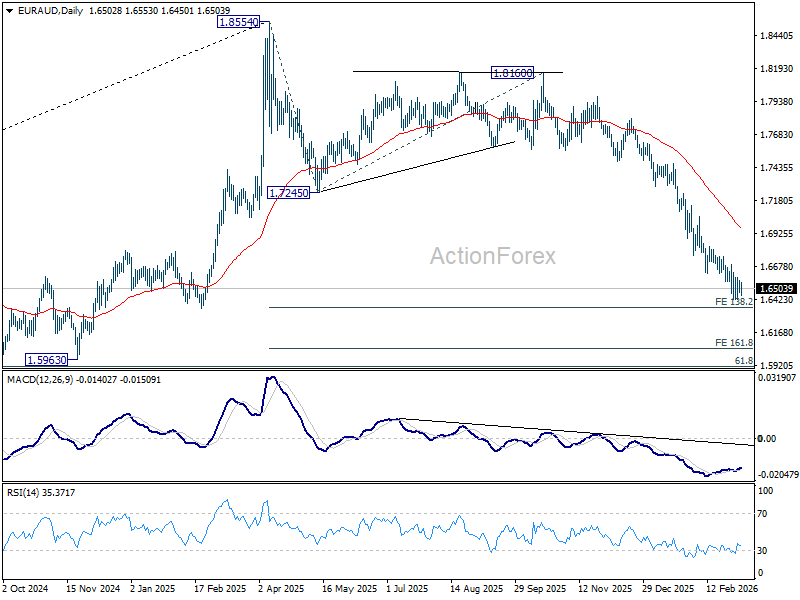 Intraday bias in EUR/AUD remains neutral for the moment and more consolidations could be seen. On the downside, sustained break of 138.2% projection of 1.8554 to 1.7245 from 1.8160 at 1.6351 will extend larger down trend to 161.8% projection at 1.6042 next. However, considering bullish convergence condition in 4H MACD, firm break of 1.6691 resistance will indicate short term bottoming. Intraday bias will be back on the upside for stronger rebound towards 55 D EMA (now at 1.6962).