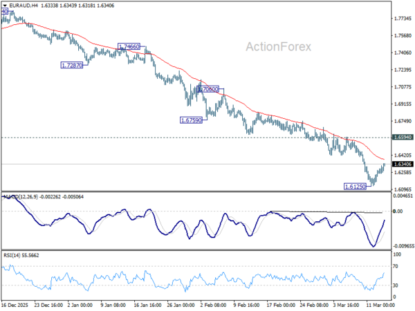 EUR/AUD’s down trend accelerated to as low as 1.6125 last week but recovered since then. Initial bias remain neutral this week for consolidations. But outlook will remain bearish as long as 1.6594 resistance holds. Firm break of 1.6125 will resume the fall from 1.8554 to 1.5913 fibonacci level next. Nevertheless, break of 1.6594 will indicate short term bottoming, and bring stronger rebound.