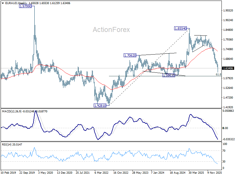 In the bigger picture, fall from 1.8554 medium term top is seen as reversing the whole up trend from 1.4281 (2022 low). Deeper decline should be seen to 61.8% retracement of 1.4281 to 1.8554 at 1.5913, which is slightly below 1.5963 structural support. Decisive break there will pave the way back to 1.4281. For now, risk will stay on the downside as long as 55 W EMA (now at 1.7273) holds, even in case of strong rebound.