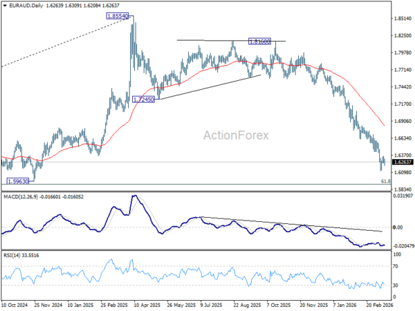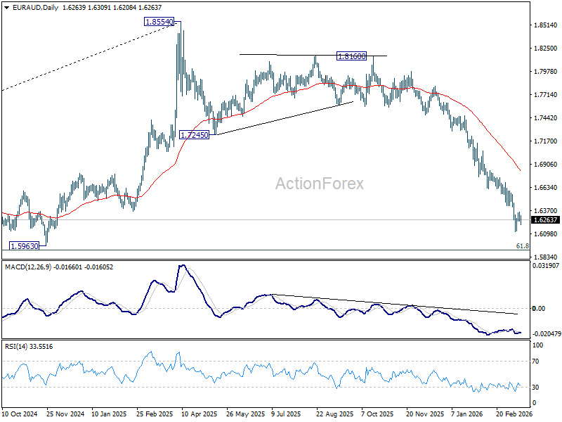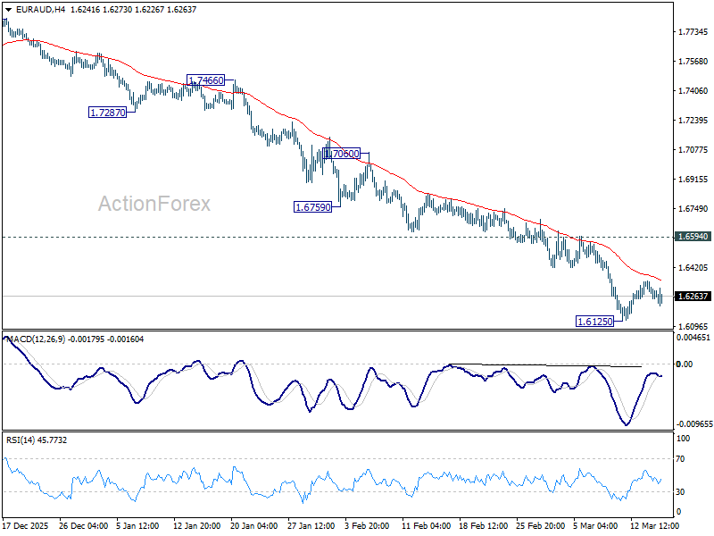 EUR/AUD is extending consolidations above 1.6125 and intraday bias remains neutral. Further decline is expected with 1.6594 resistance intact. Firm break of 1.6125 will resume the fall from 1.8554 to 1.5913 fibonacci level next. Nevertheless, break of 1.6594 will indicate short term bottoming, and bring stronger rebound.