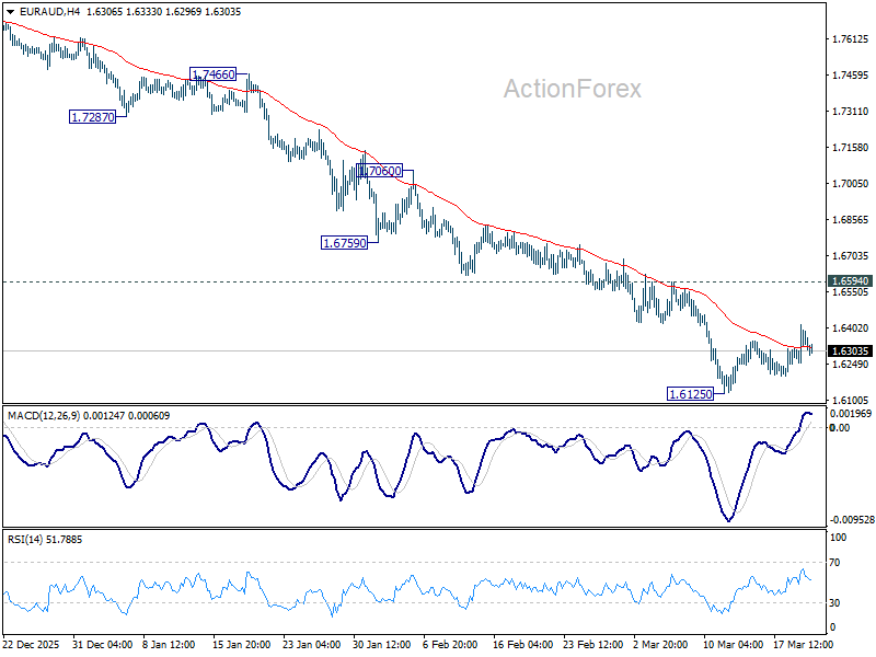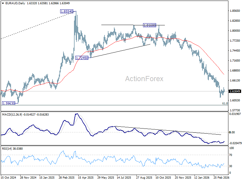Intraday bias in EUR/AUD stays neutral as consolidations continues above 1.6125. Further decline is expected with 1.6594 resistance intact. Firm break of 1.6125 will resume the fall from 1.8554 to 1.5913 fibonacci level next. Nevertheless, break of 1.6594 will indicate short term bottoming, and bring stronger rebound.
