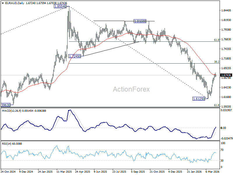Intraday bias in EUR/AUD is turned neutral first with current retreat. On the upside, above 1.6803 will extend the rebound from 1.6125 to 38.2% retracement of 1.8554 to 1.6125 at 1.7053. However, break of 1.6561 minor support will argue that the rebound has completed, after rejection by 55 D EMA (now at 1.6754). Retest of 1.6125 low should be seen next.