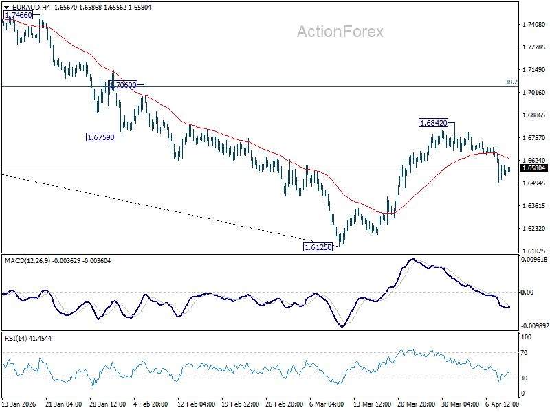 Intraday bias in EUR/AUD remains mildly on the downside for the moment. Corrective rebound from 1.6125 could have completed at 1.6842 after rejection by 55 D EMA (now at 1.6733). Deeper fall should be seen to retest 1.6125. Firm break there will resume larger down trend. On the upside, though, break of 1.6842 will resume the rebound to 38.2% retracement of 1.8554 to 1.6125 at 1.7053.