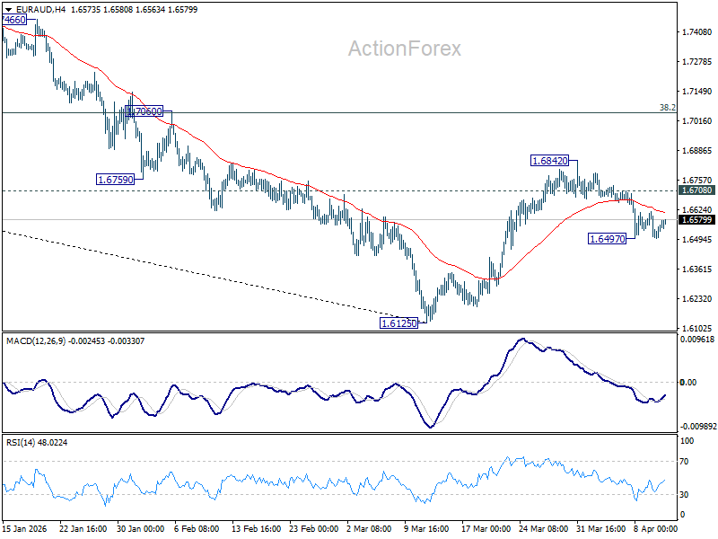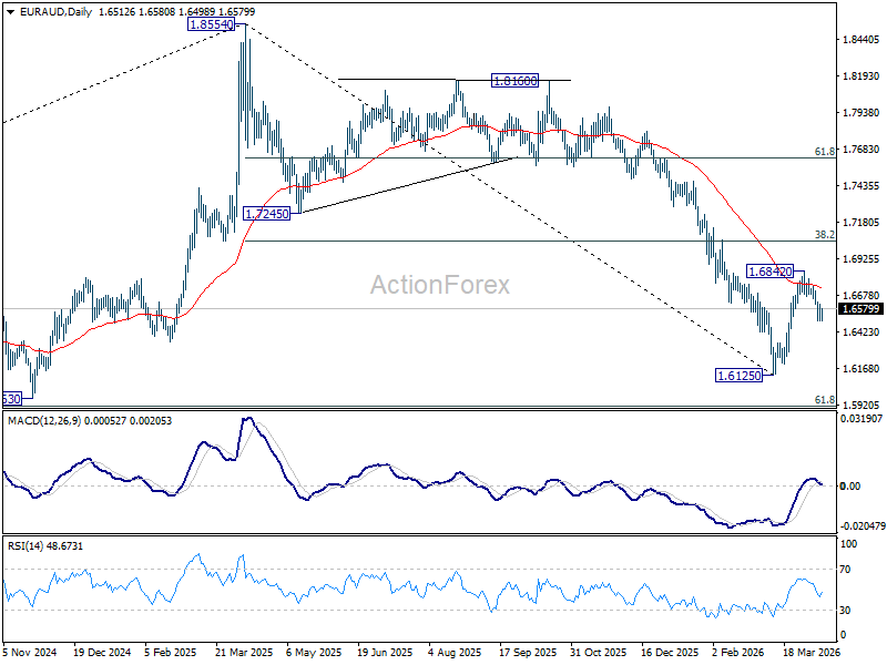 EUR/AUD’s extended pullback last week suggests that rebound from 1.6125 has completed at 1.6842, after rejection by 55 D EMA (now at 1.6720). But as a temporary low as formed at 1.6497, initial bias is turned neutral this week first. On the downside, break of 1.6497 will target a retest on 1.6125 low. Nevertheless, firm break of 1.6708 will should resume the rebound from 1.6125 through 1.6842 to 38.2% retracement of 1.8554 to 1.6125 at 1.7053.