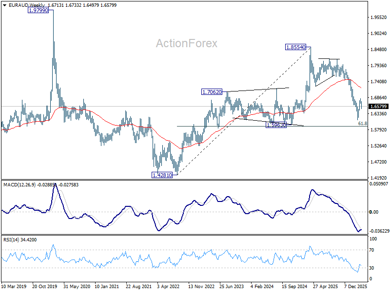 In the bigger picture, fall from 1.8554 (2025 high) is in progress and deeper decline should be seen to 61.8% retracement of 1.4281 to 1.8554 at 1.5913, which is slightly below 1.5963 structural support. Decisive break there will pave the way back to 1.4281 (2022 low). For now, risk will stay on the downside as long as 55 W EMA (now at 1.7184) holds, even in case of strong rebound.