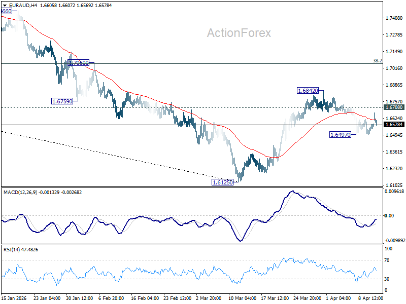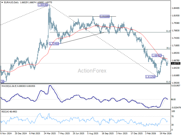Intraday bias in EUR/AUD remains neutral for the moment. As noted before, rebound from 1.6125 could have completed at 1.6842, after rejection by 55 D EMA (now at 1.6720). Below 1.6497 will bring retest of 1.6125 low first. Nevertheless, firm break of 1.6708 will should resume the rebound from 1.6125 through 1.6842 to 38.2% retracement of 1.8554 to 1.6125 at 1.7053.