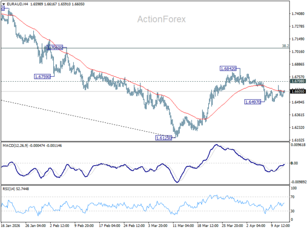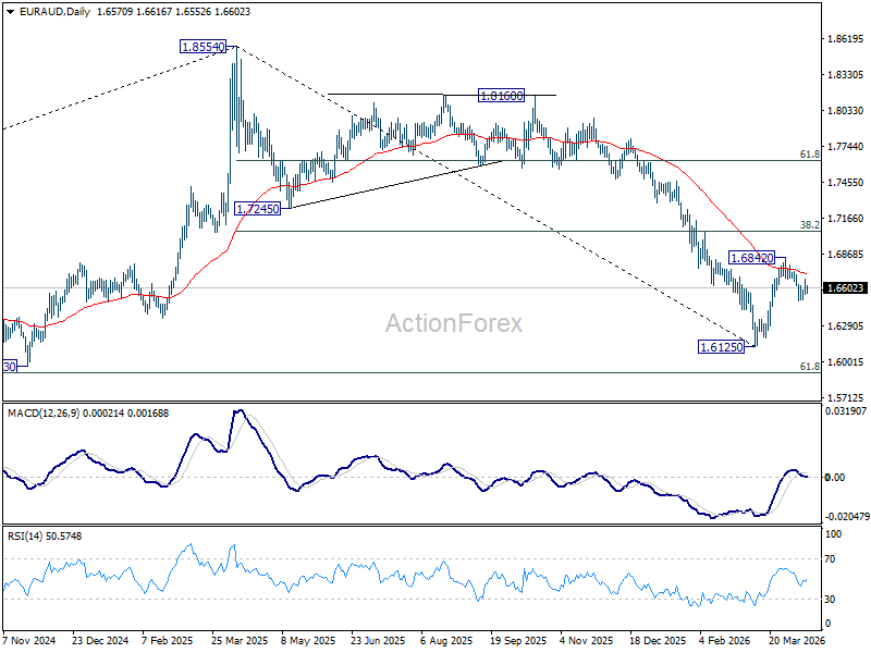Intraday bias in EUR/AUD remains neutral. Outlook is unchanged that rebound from 1.6125 could have completed at 1.6842, after rejection by 55 D EMA (now at 1.6720). Below 1.6497 will bring retest of 1.6125 low first. Nevertheless, firm break of 1.6708 will should resume the rebound from 1.6125 through 1.6842 to 38.2% retracement of 1.8554 to 1.6125 at 1.7053.