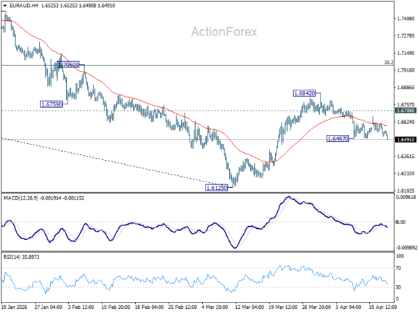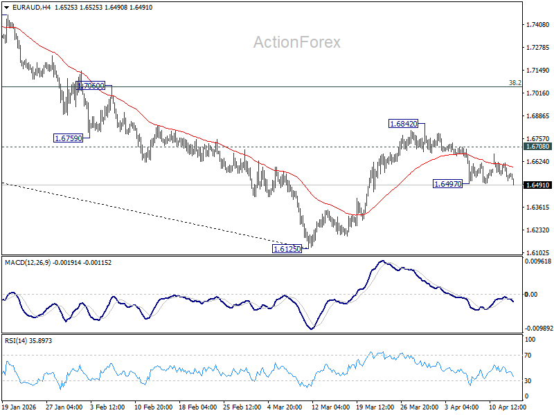 Intraday bias in EUR/AUD is back on the downside with breach of 1.6497 temporary low. Fall from 1.6842 is resuming and should target a retest on 1.6125 low. On the upside, above 1.6667 minor resistance will turn intraday bias neutral again first.