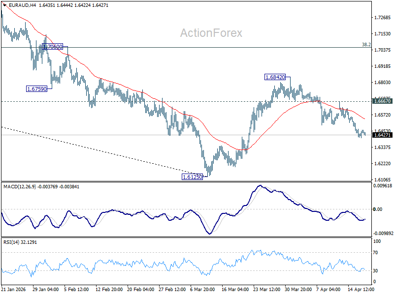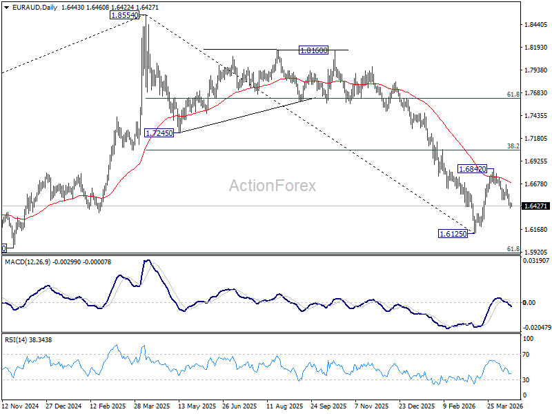 Intraday bias in EUR/AUD remains on the downside as fall from 1.6842 is in progress for retesting 1.6125 low. Firm break there will resume whole down trend from 1.8554 to 1.5913 fibonacci level next. For now, risk will stay on the downside as long as 1.6667 resistance holds, in case of recovery.