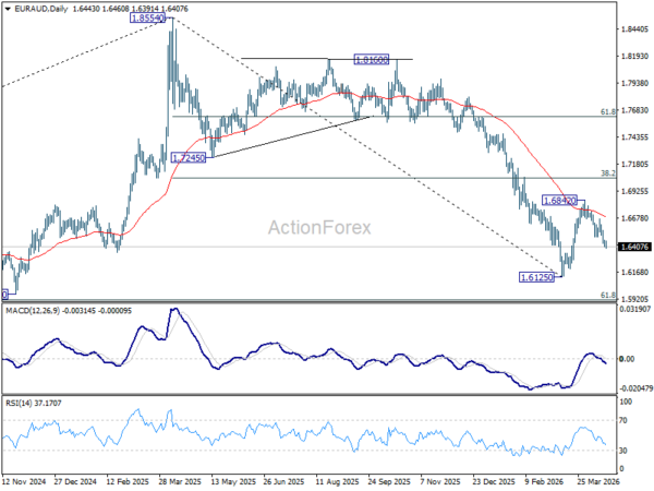 EUR/AUD’s fall from 1.6842 resumed last week. Outlook is unchanged that rebound from 1.6125 should have completed after rejection by 55 D EMA. Initial bias remains on the downside this week for retesting 1.6125 low. Firm break there will resume whole down trend from 1.8554 to 1.5913 fibonacci level next. For now, risk will stay on the downside as long as 1.6667 resistance holds, in case of recovery.