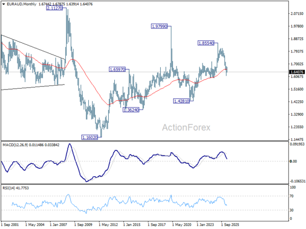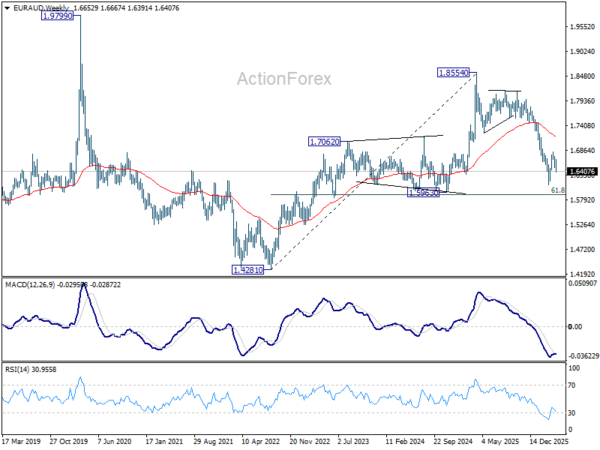 In the bigger picture, fall from 1.8554 (2025 high) is in progress and deeper decline should be seen to 61.8% retracement of 1.4281 to 1.8554 at 1.5913, which is slightly below 1.5963 structural support. Decisive break there will pave the way back to 1.4281 (2022 low). For now, risk will stay on the downside as long as 55 W EMA (now at 1.7157) holds, even in case of strong rebound.