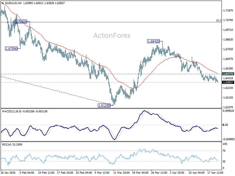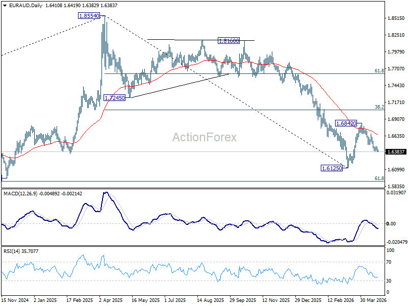Intraday bias in EUR/AUD stays on the downside as fall from 1.6842 is extending. Deeper decline should be seen to retest 1.6125 low. Firm break there will resume whole down trend from 1.8554 to 1.5913 fibonacci level next. On the upside, above 1.6477 minor resistance will turn intraday bias neutral first.