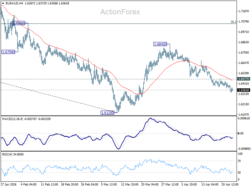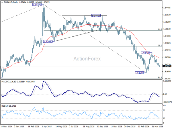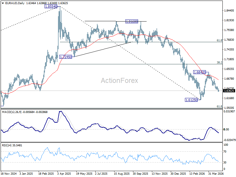 EUR/AUD’s fall from 1.6842 is in progress and intraday bias remains neutral. Deeper decline should be seen to retest 1.6125 low. Firm break there will resume whole down trend from 1.8554 to 1.5913 fibonacci level next. On the upside, above 1.6477 minor resistance will turn intraday bias neutral first.