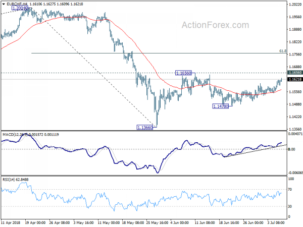 EUR/CHF rises further to as high as 1.1627 so far today. But upside is limited below 1.1656 resistance. Intraday bias stays neutral at this point. On the upside, break of 1.1656 will resume the rebound from 1.1366 to 61.8% retracement of 1.2004 to 1.1366 at 1.1760. But we would expect strong resistance from there to limit upside. On the downside, break of 1.1478 will turn bias to the downside for 1.1366 first. Break will resume the corrective fall from 1.2004.