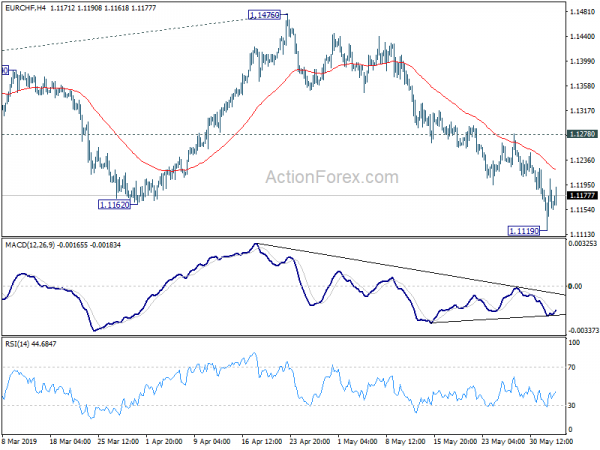 EUR/CHF formed a temporary low after dropping to 1.1119. Intraday bias is turned neutral for some consolidations. Upside should be limited by 1.1278 resistance to bring another fall. On the downside, break of 1.1119 will extend whole decline from 1.2004 and target 61.8% projection of 1.2004 to 1.1173 from 1.1476 at 1.0962 next.