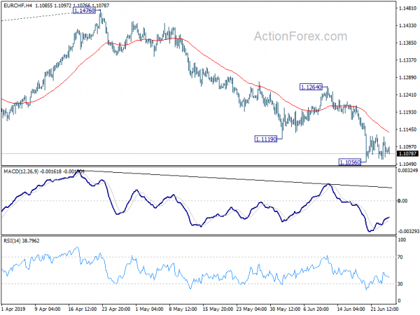 EUR/CHF is staying in consolidation from 1.1056 temporary low and intraday bias remains neutral for the moment. In case of another recovery, upside should be limited below 1.1264 resistance to bring further decline. On the downside, break of 1.1056 will resume the larger down trend for 61.8% projection of 1.2004 to 1.1173 from 1.1476 at 1.0962 next.