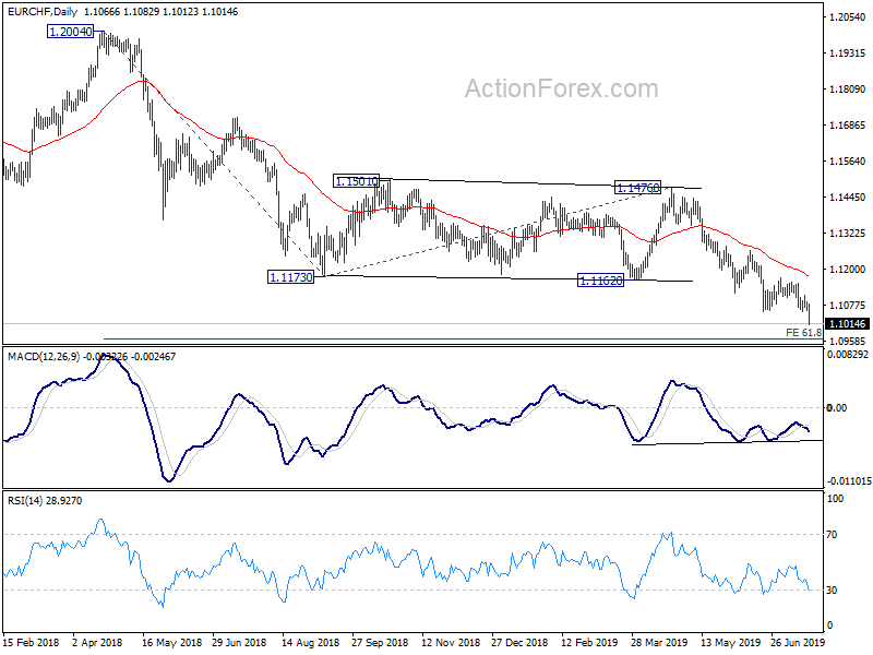 EUR/CHF’s down trend resumed last week by braking 1.1056 to as low as 1.1012. Initial bias remains on the downside this week. next target is 61.8% projection of 1.2004 to 1.1173 from 1.1476 at 1.0962. On the upside, break of 1.1154 resistance is needed to signal short term bottoming. Otherwise outlook will remain bearish in case of recovery.