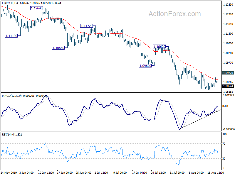 With 1.0922 minor resistance intact, further decline is expected in EUR/CHF to 100% projection of 1.2004 to 1.1173 from 1.1476 at 1.0645. Though, break of 1.0922 resistance will indicate short term bottoming and bring stronger rebound to 1.1062 resistance.