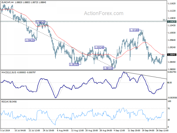 Intraday bias in EUR/CHF remains neutral at this point. Consolidation pattern from 1.0811 is still extending. And another recovery cannot be ruled out. But in that case, upside should be limited by 1.1062 cluster resistance (38.2% retracement of 1.1476 to 1.0811 at 1.1065). On the downside, sustained break of 1.0811 will resume larger down trend and target 1.0629 key support next.